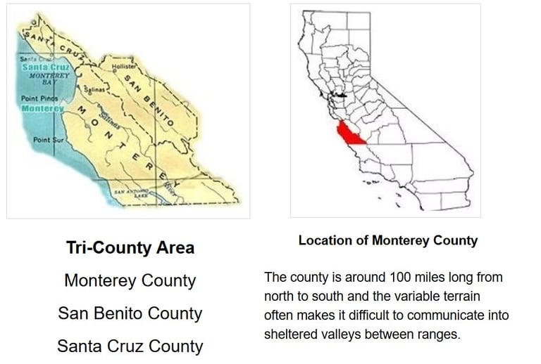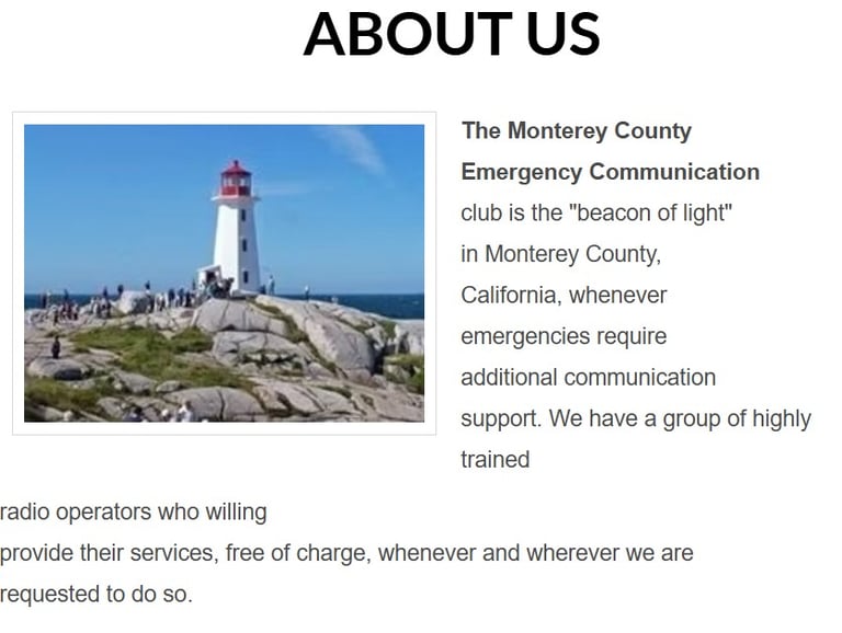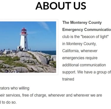 Amateur Radio Operators (HAMS) of Monterey County support local agencies whenever an emergency calls for extra communication resources. Although we are called "amateurs" we are very professional in the level of service we provide as a volunteer (non paid) network of highly skilled communication personnel.